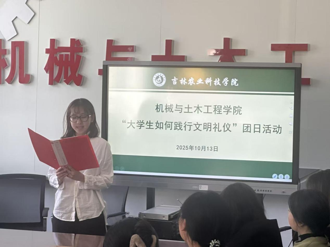 为深化团员思想引领,传承红色基因,机械与土木工程学院于10月13日12时30分在耕读楼106会议室开展“大学生如何践行文明礼仪”主题团日活动,机械与土木工程学院团委负责人韩凯旭老师以及2025级团员参与此次活动。本次活动由机械与土木工程学院蒋卓然同学主持。
