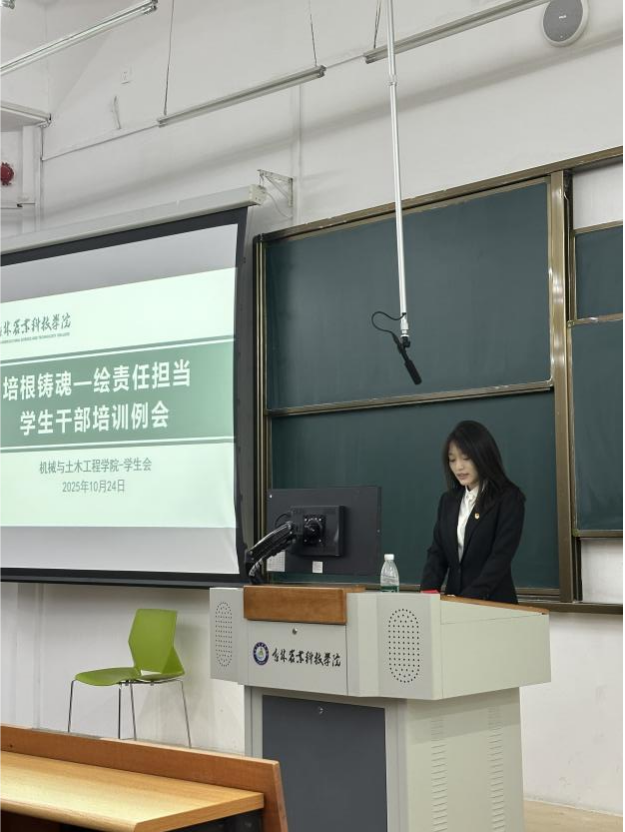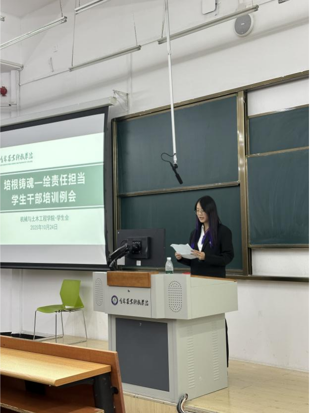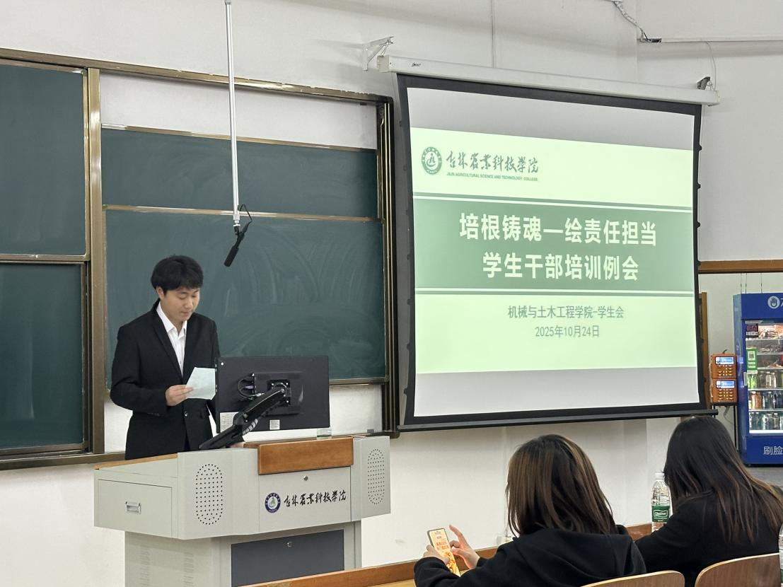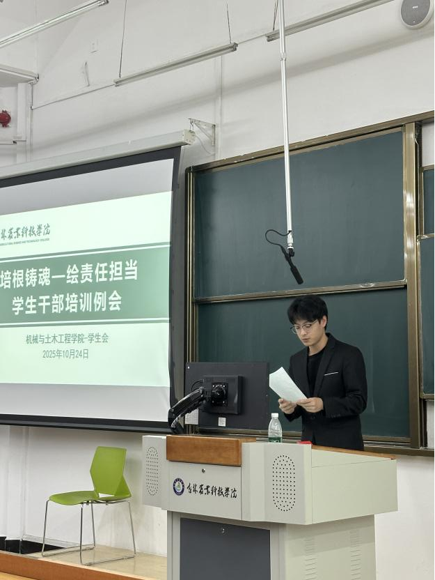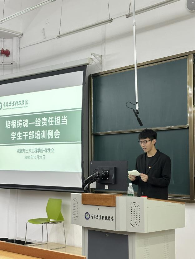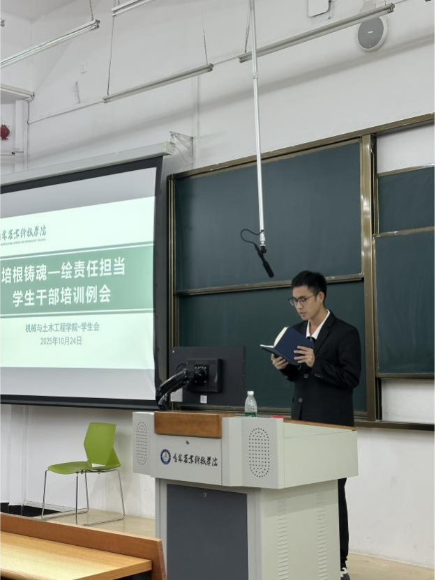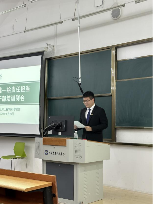 为深入学习贯彻党的二十大精神,落实学院“学风建设”等工作要求,进一步提升学生组织服务效能,我院于2025年10月24日17时在明仁楼104教室召开学生会第二次培训例会,会议由主席团成员姚嘉浩主持。我院学工办主任王嗣胤,副主任韩凯旭以及学工办全体教师,分管主席团成员参与。
