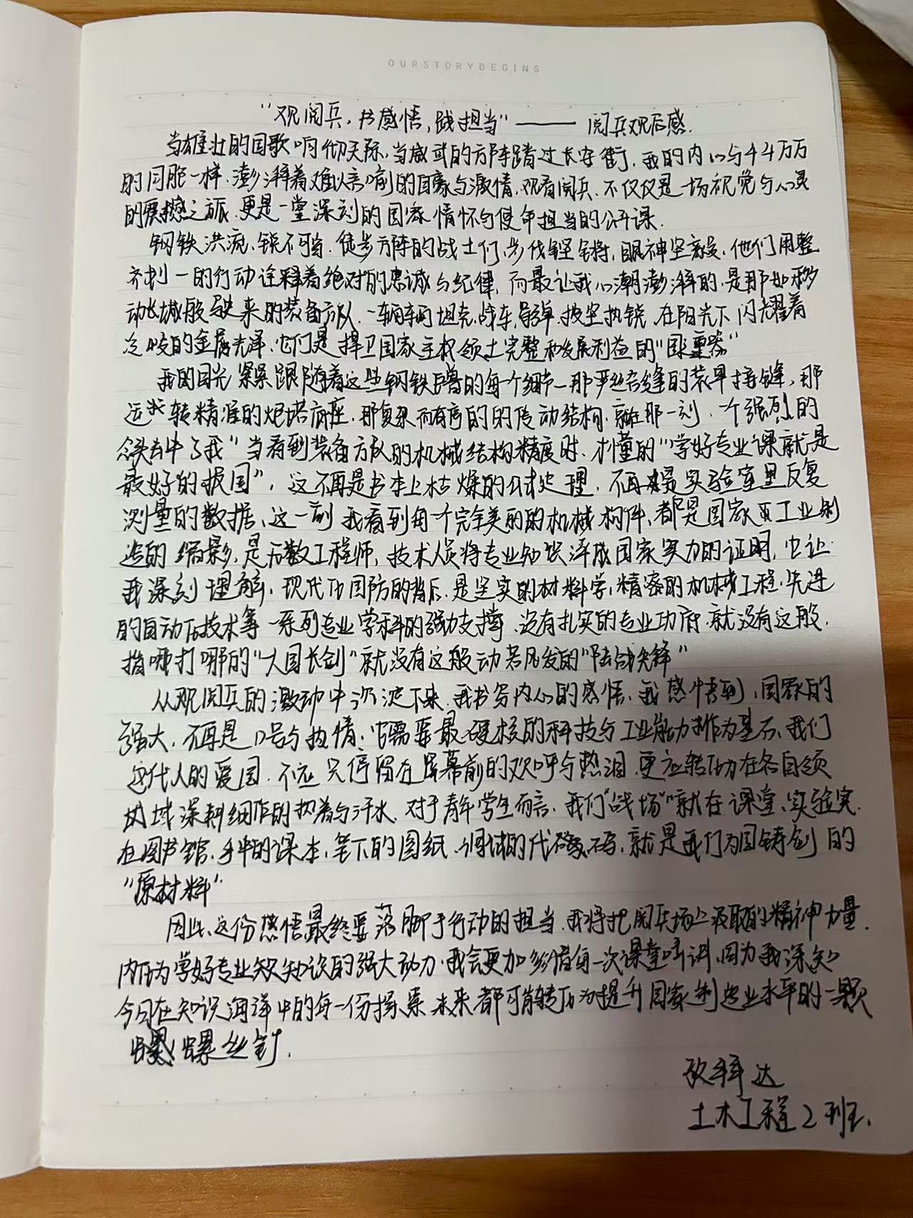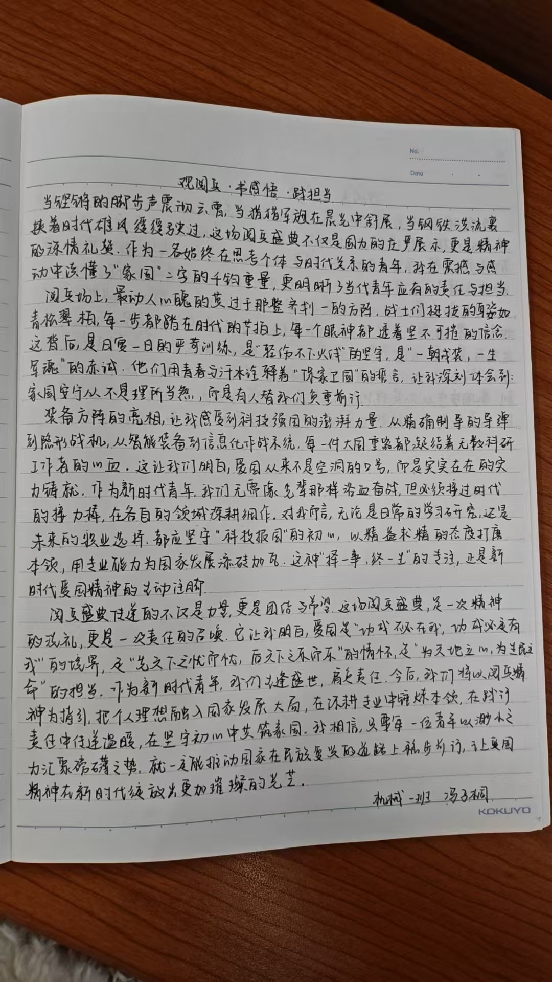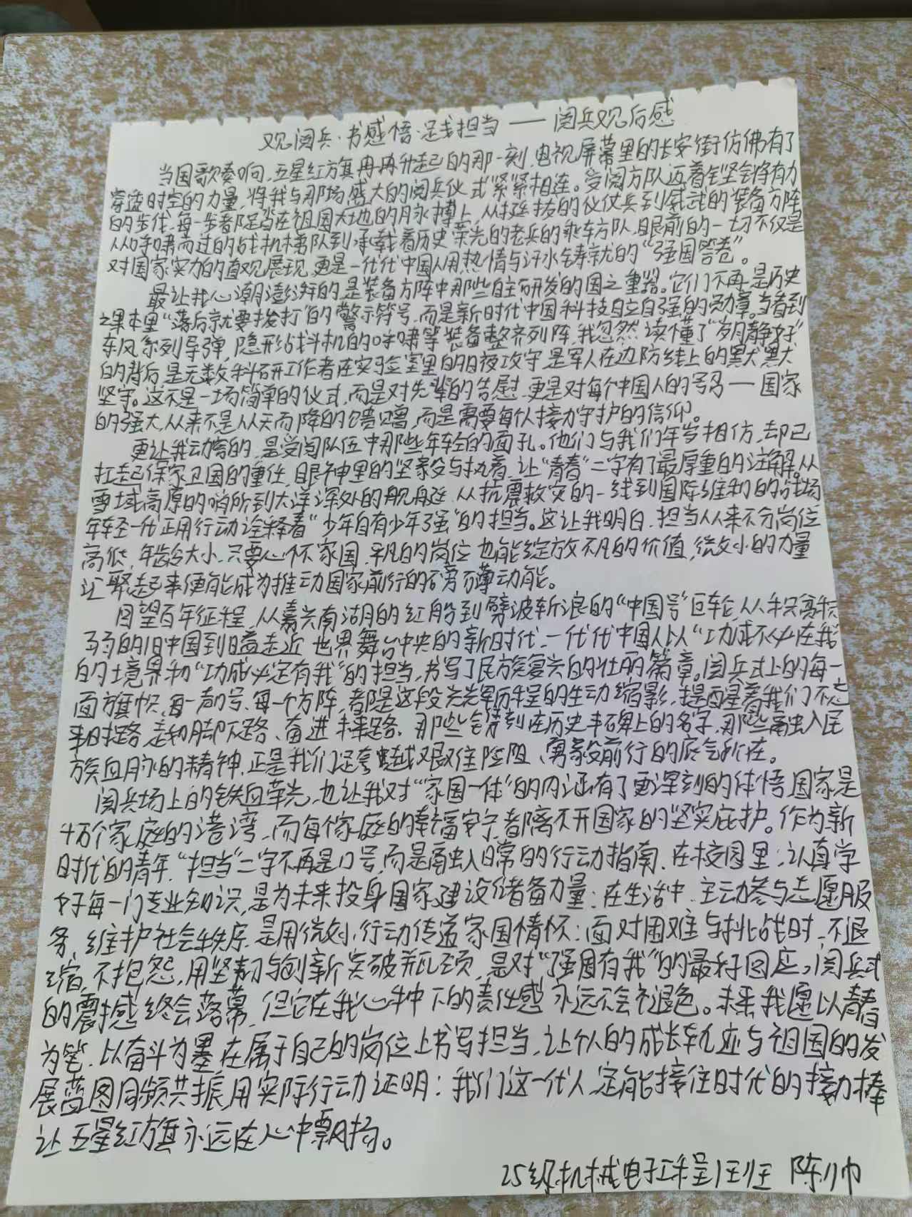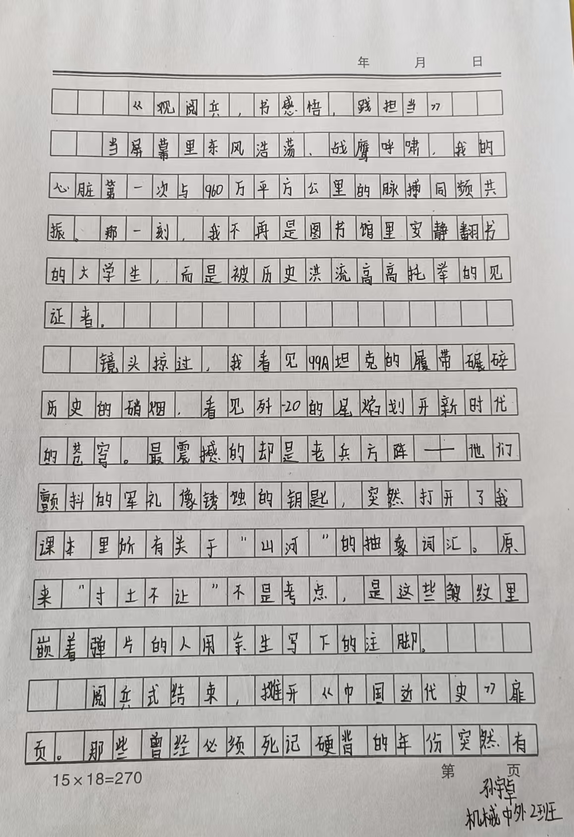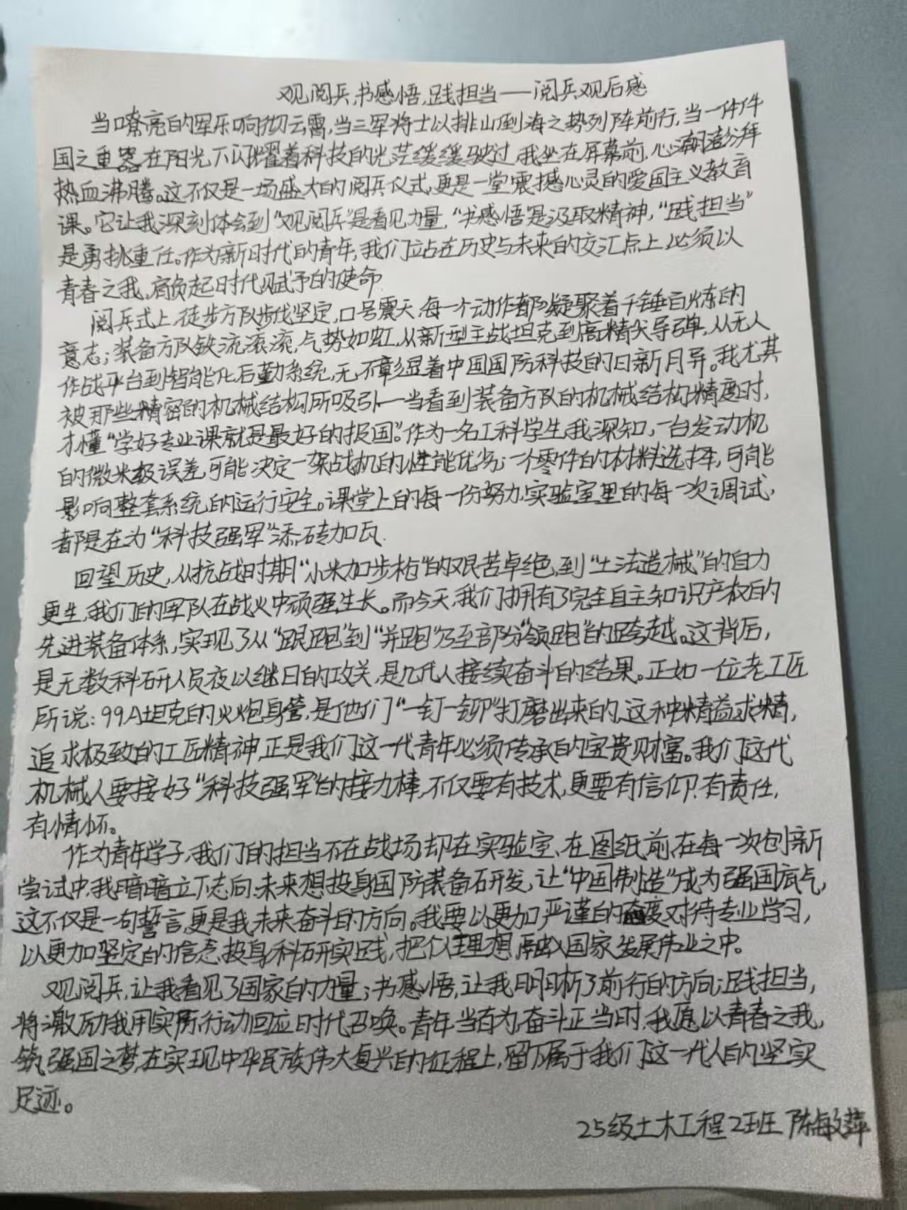 有的同学在稿纸上写下“当看到装备方队的机械结构精度时,才懂‘学好专业课就是最好的报国’”;有的同学感慨“从抗战时期的‘土法造械’到如今的智能装备,我们这代机械人要接好‘科技强军’的接力棒”;还有的同学结合专业方向写下“未来想投身国防装备研发,让‘中国制造’成为强国底气”。