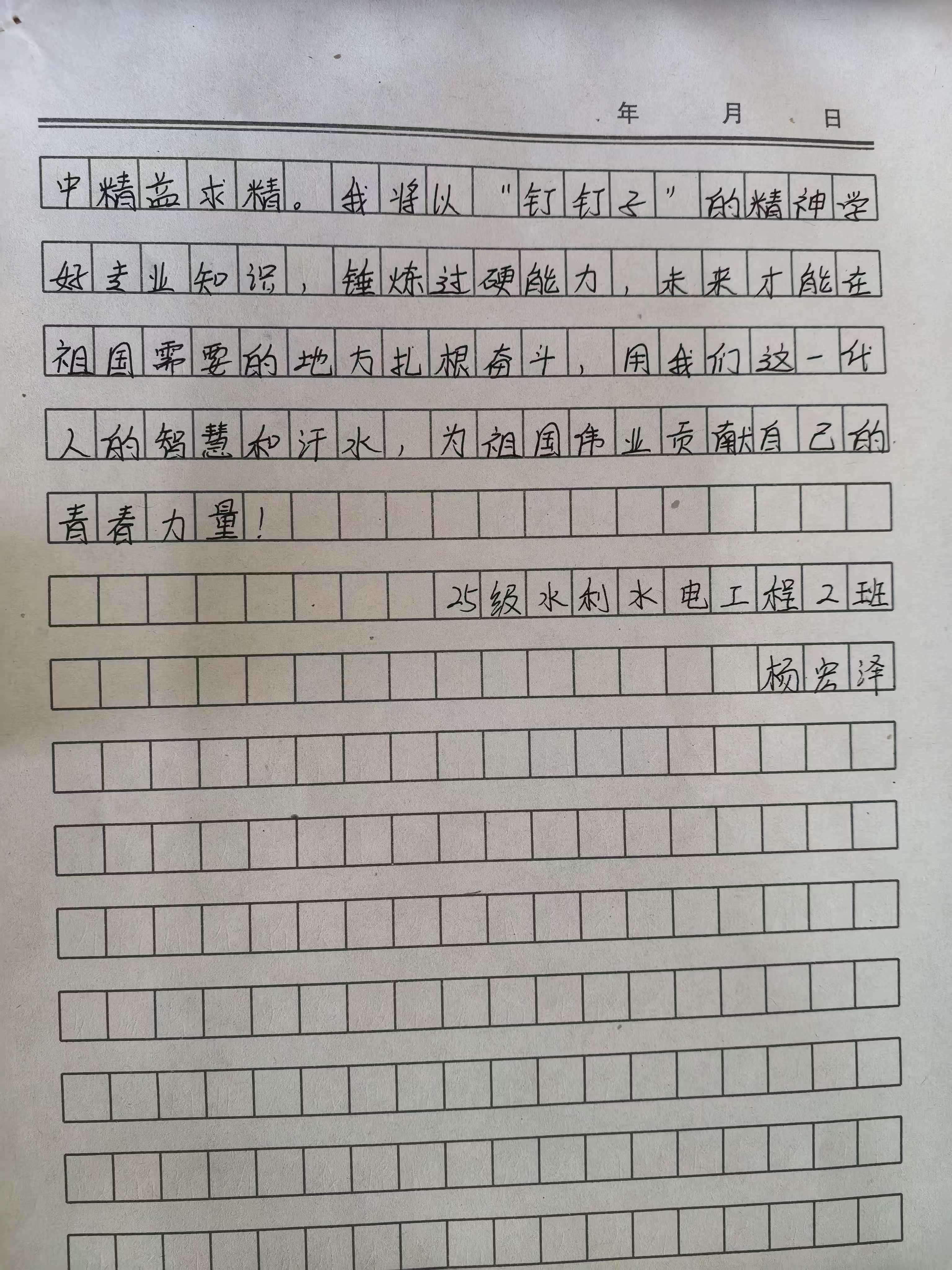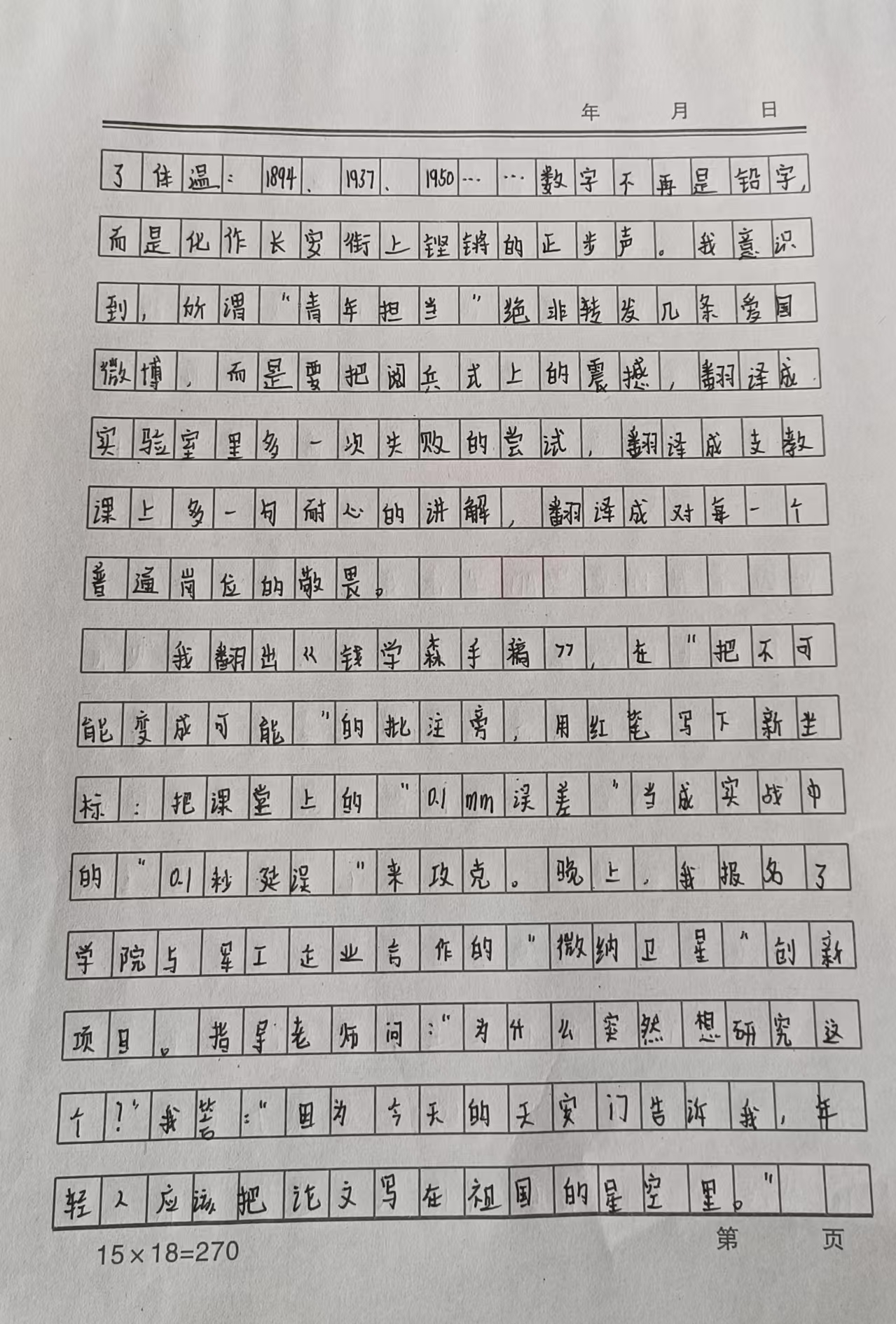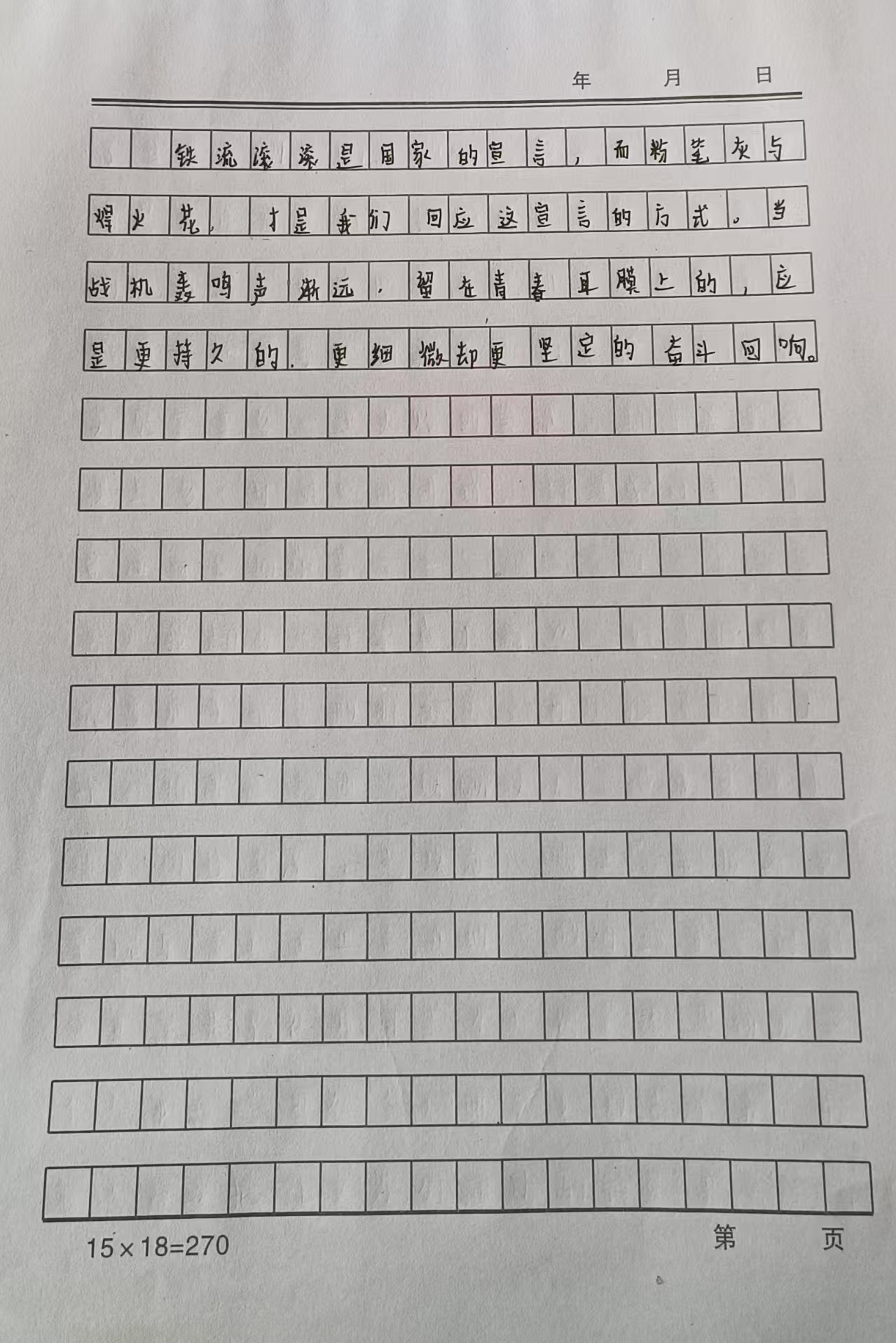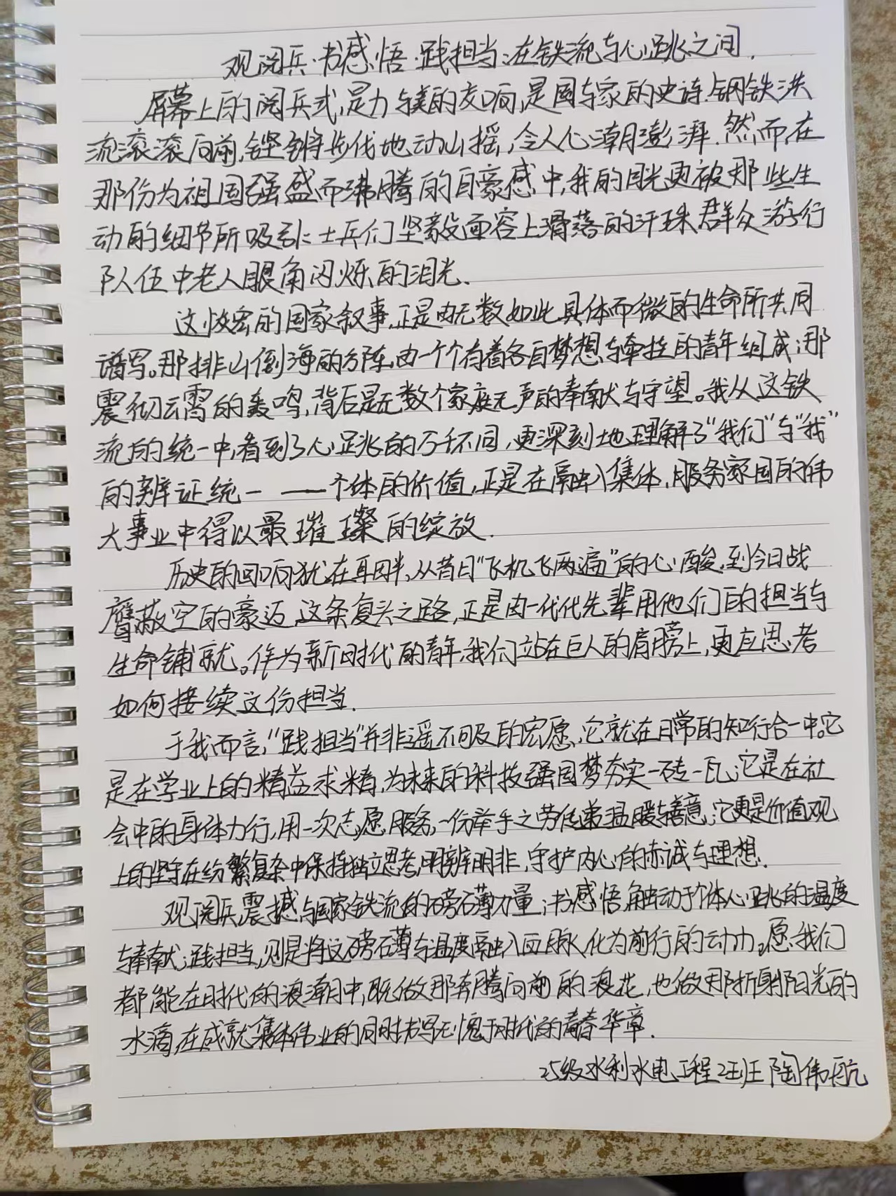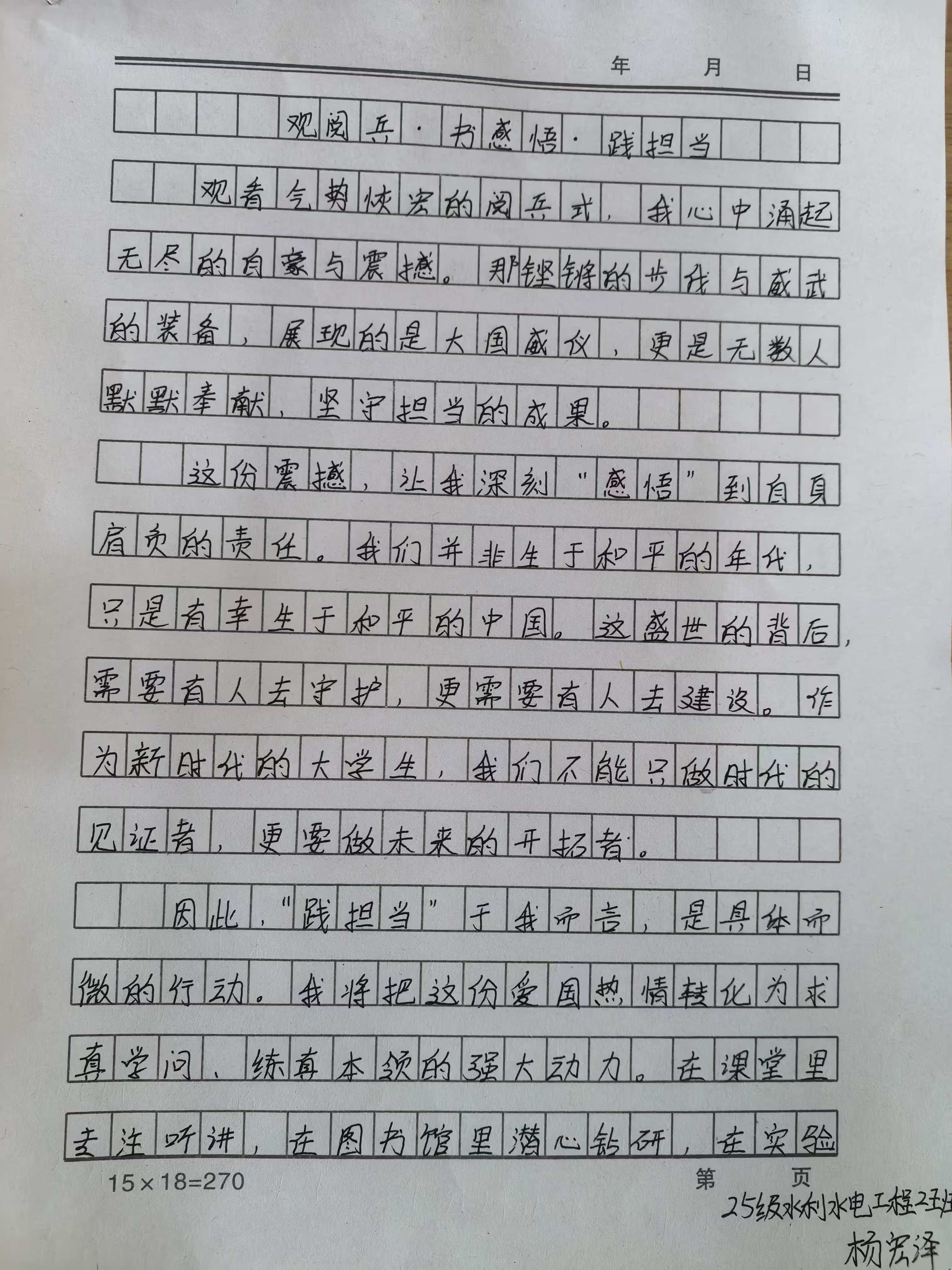 有的同学在稿纸上写下“当看到装备方队的机械结构精度时,才懂‘学好专业课就是最好的报国’”;有的同学感慨“从抗战时期的‘土法造械’到如今的智能装备,我们这代机械人要接好‘科技强军’的接力棒”;还有的同学结合专业方向写下“未来想投身国防装备研发,让‘中国制造’成为强国底气”。