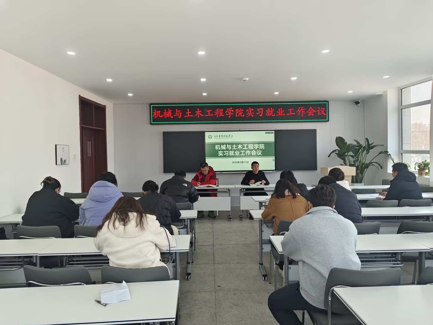 为进一步压实实习就业工作责任,精准推进学生实习安排与就业服务工作,2026 年 3 月 11 日13:00,机械与土木工程学院在耕读楼 201 室召开实习就业工作专题会议。会议由副院长崔博主持,殷飞、王嗣胤、韩凯旭、刘叶及全体实习指导教师参加会议。