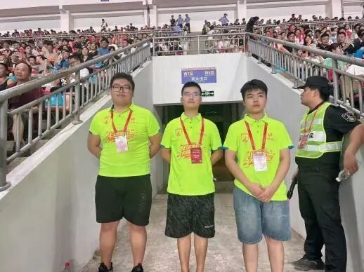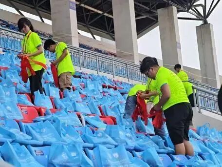比赛日早上9点,交通引导组的队员们在朝阳下拉开隔离带,交通引导组引导车辆有序停放,精准解答问路;物料补给组穿梭看台换水桶、递凉茶,关注观众状态。