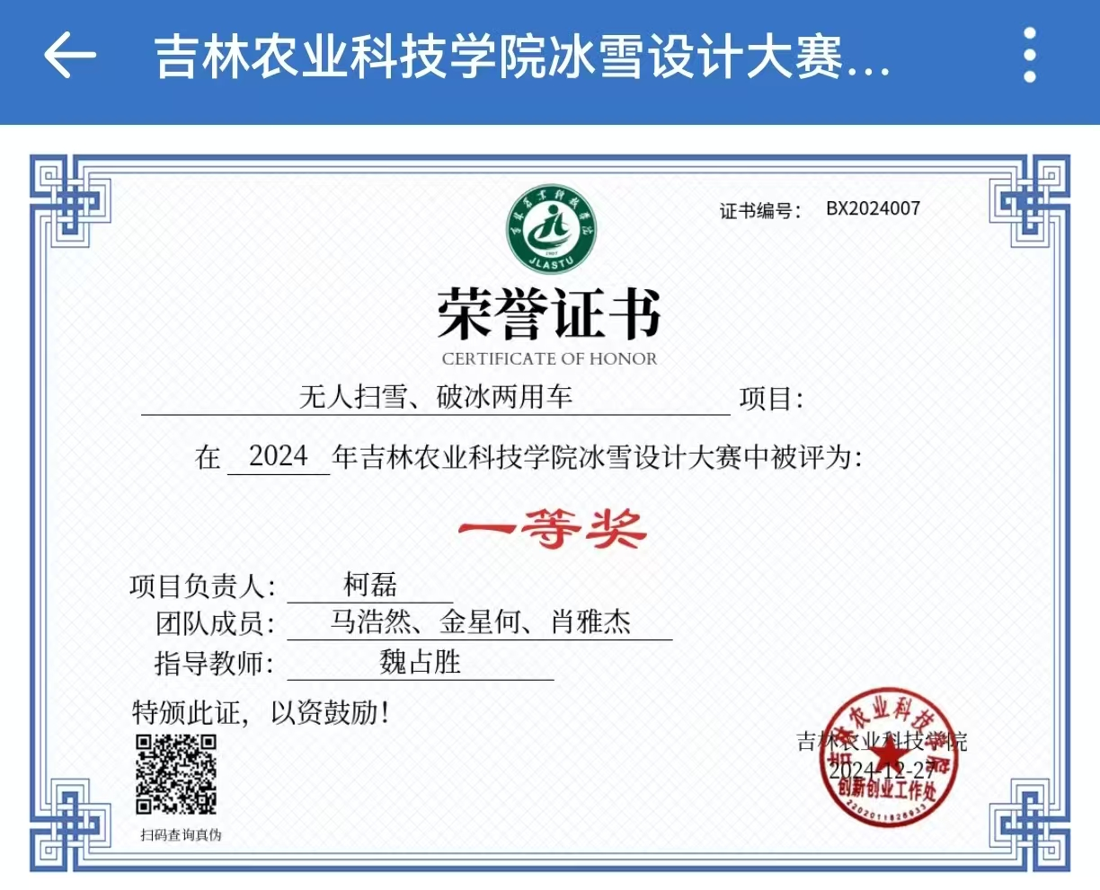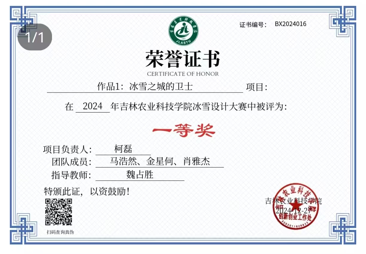 课外时间里,柯磊始终保持着 “勇于探索、敢于创新” 的劲头,积极投身各类学科竞赛与创新实践,在实战中锤炼本领。他曾荣获 2024 年吉林省 “挑战杯” 大学生创业计划竞赛省级银奖、2025 届第十二届全国大学生机械创新设计大赛吉林赛区创意组省级二等奖、2024 年吉林省第六届冰雪创意大赛产品类省级二等奖;此外,还斩获第十一届全国大学生机械创新设计大赛(青蛙类、蝴蝶类)省级三等奖、2024 年吉林省第六届冰雪创意大赛场地设备类省级三等奖,以及冰雪设计大赛校级一等奖 2 次、第九届中国国际 “互联网 +” 创新创业大赛校级二等奖 2 次、第五届冰雪创意大赛校级二等奖 2 次、大学生职业规划大赛校级二等奖等校级奖项 21 项。从省级赛场到校级舞台,每一次获奖都是他突破自我的见证,每一份成绩都凝结着他对创新的执着。