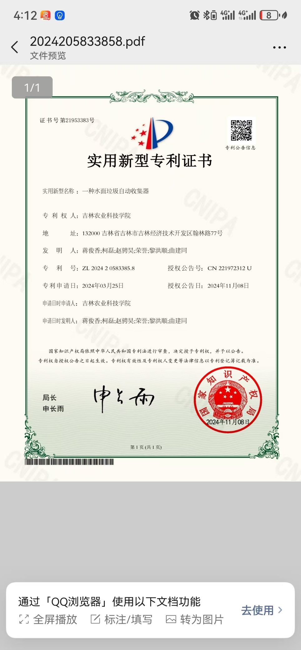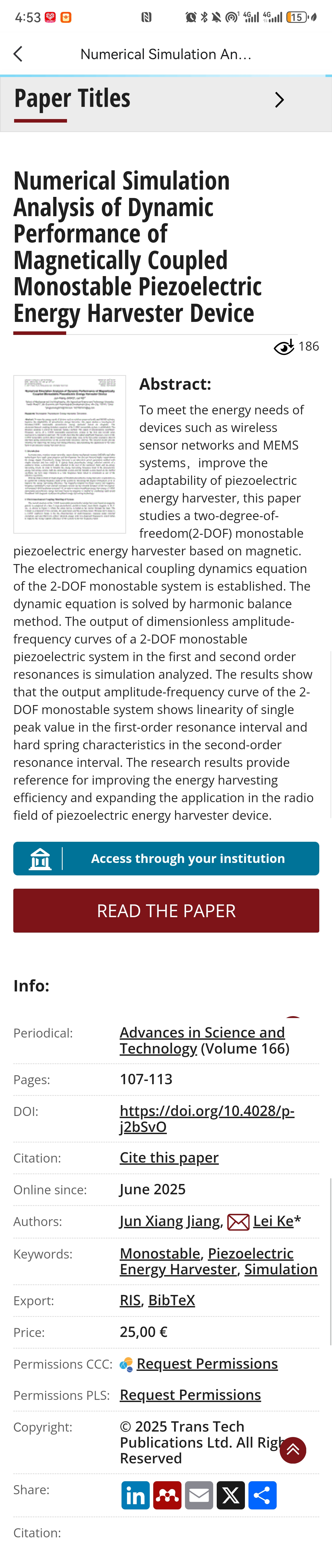 科研之路上,柯磊同样步履不停。他深知 “科研需沉心,创新要扎根”,始终潜心钻研专业领域的前沿问题,用实际成果诠释青年学子的科研担当:以第一发明人身份完成国家级实用新型专利 1 项;以第一作者身份在 EI 期刊发表论文《Numerical Simulation Analysis of Dynamic Performance of Magnetically Coupled Monostable Piezoelectric Energy Harvester Device》,并在国家级期刊发表《水面垃圾自动收集器装置设计》《环保装置共享清洁柜》《学生干部经历对就业的影响》3 篇学术论文;作为第二负责人参与国家级重点领域创新创业科研项目,同时主持 1 项、参与 1 项省级大学生创新创业训练项目。从专利申请到论文发表,从项目主持到团队协作,柯磊在科研实践中不断积累经验,逐步成长为兼具理论素养与实践能力的创新型人才。