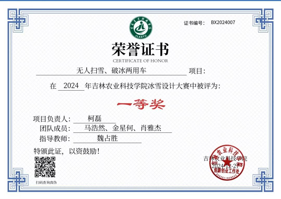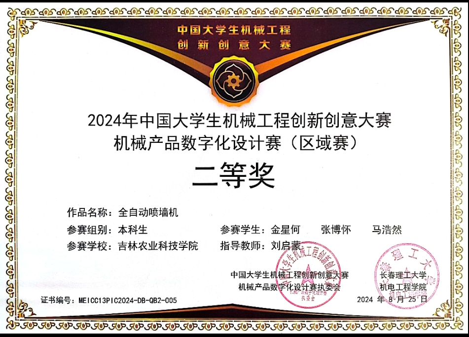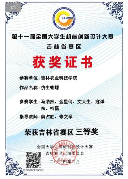 无论是国家级赛场的高水准较量,还是省级舞台的同台竞技,马浩然始终以敢闯敢拼的劲头迎接每一次挑战,20余项重要奖项的荣誉加持,让他成为竞赛场上实力与毅力兼具的“常胜将军”。一举拿下2024年全国大学生机械工程创意创新大赛国家级二等奖、第十届全国应用型人才综合技能大赛国家级二等奖,展现国家级赛事中的硬核实力;此外,还获2024年全国大学生创新发明大赛(东北区域赛)三等奖、2024年中国大学生机械工程创新创意大赛机械产品数字化设计赛(区域赛)二等奖,在2025届第十二届全国大学生机械创新设计大赛吉林赛区比赛中,凭借“仿生蝴蝶”“仿生叶菜净化” 两项作品双获创意组省级一等奖;同时,摘得2024年吉林省“挑战杯”大学生创业计划竞赛社会调研专项赛银奖、2024年第六届吉林省高校冰雪创意大赛省级二等奖、第七届吉林省大学生网络文化节省级二等奖;还曾获第十一届全国大学生机械创新设计大赛吉林赛区“仿生蝴蝶”“仿生青蛙”两项三等奖、第六届吉林省大学生物理实验竞赛省级三等奖、第六届“吉林省电子商务案例分析大赛”案例分析赛道省级三等奖,在校级竞赛中持续发力,累计获得校级奖项35项,用全方位的成绩证明自身综合实力。