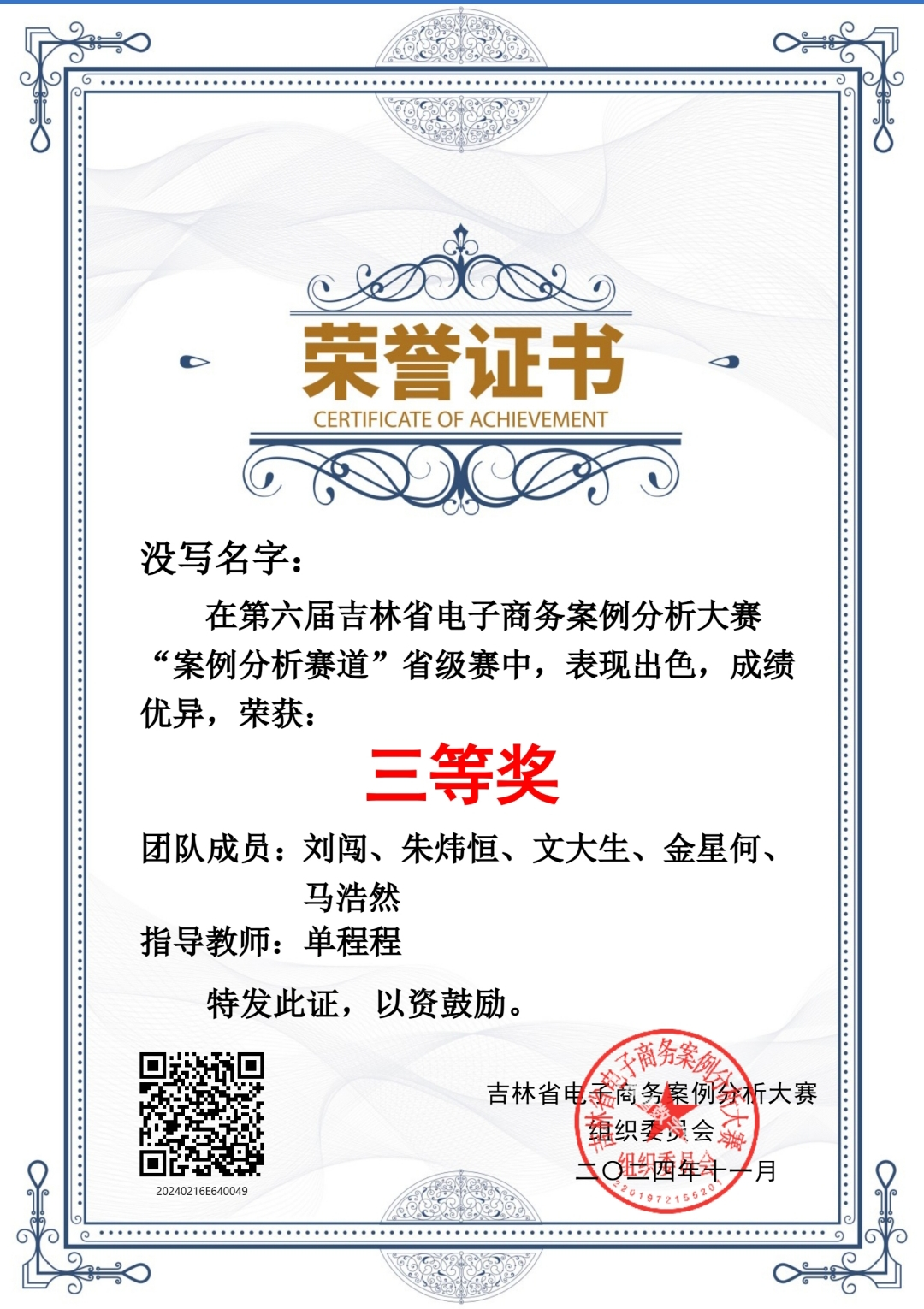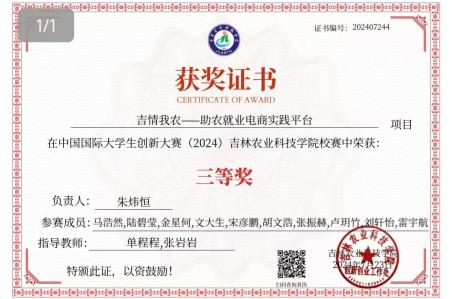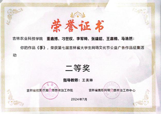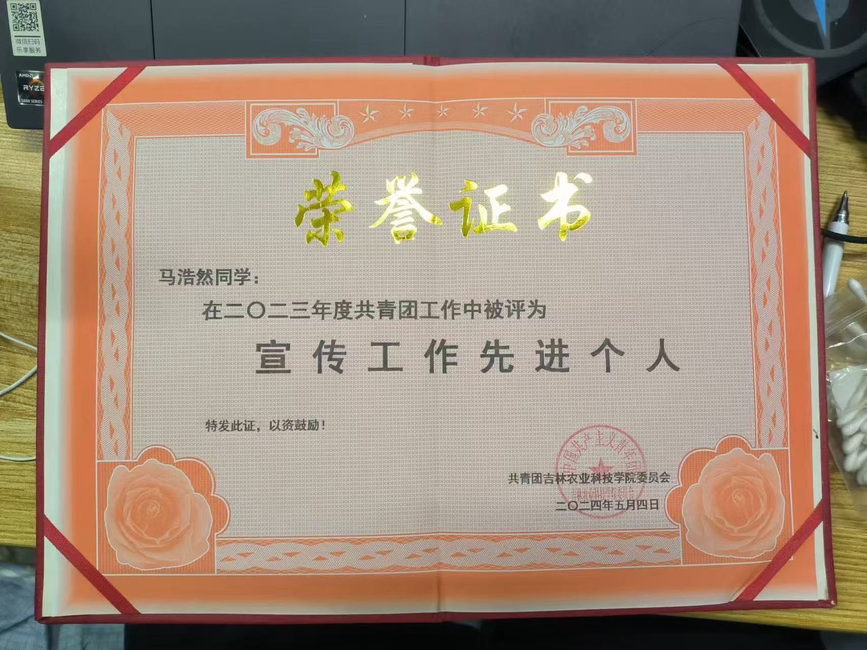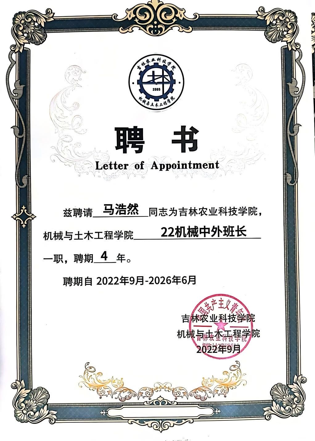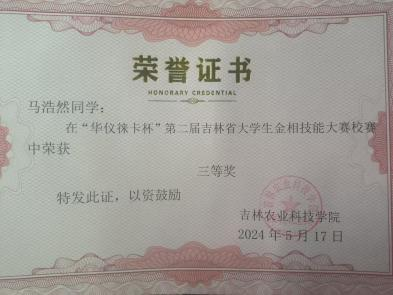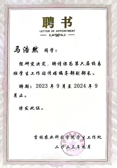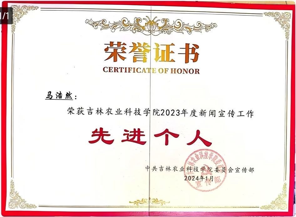 此外,马浩然还积极投身志愿服务,2023 年获评“吉林市马拉松优秀志愿者”,用实际行动践行社会责任,展现新时代大学生的公益情怀。