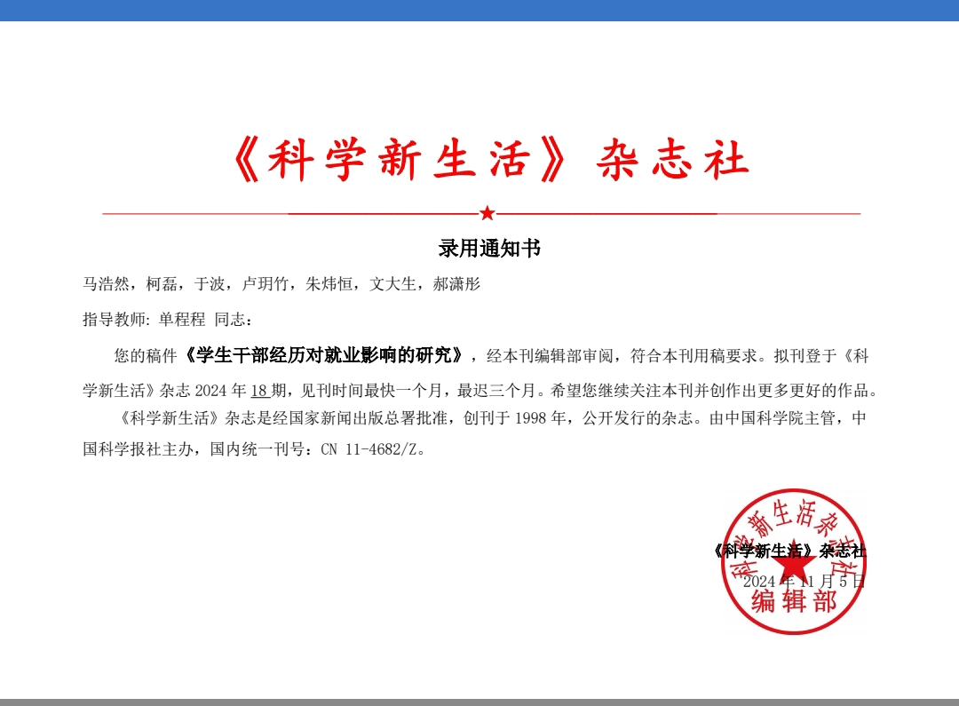 在科研领域,马浩然展现出极强的探索精神与创新能力,用一项项成果书写青年担当:他以第一负责人身份牵头国家级重点领域创新创业科研项目,带领团队攻克技术难题,在重点领域的实践探索中积累宝贵经验;以第一作者身份在国家期刊及SCI期刊各发表论文一篇,将研究成果转化为学术文字;以第二作者身份发表1篇EI论文及1篇国家期刊论文,在更高层次的学术平台上展现研究实力;不仅自主攻关,还积极参与科研协作,先后参与1项国家级大创项目、1项省级重点课题及1项校级课题项目,在团队合作中拓宽研究思路,提升科研素养。