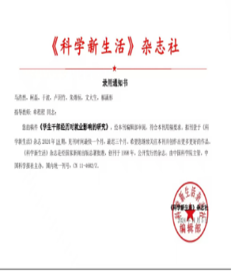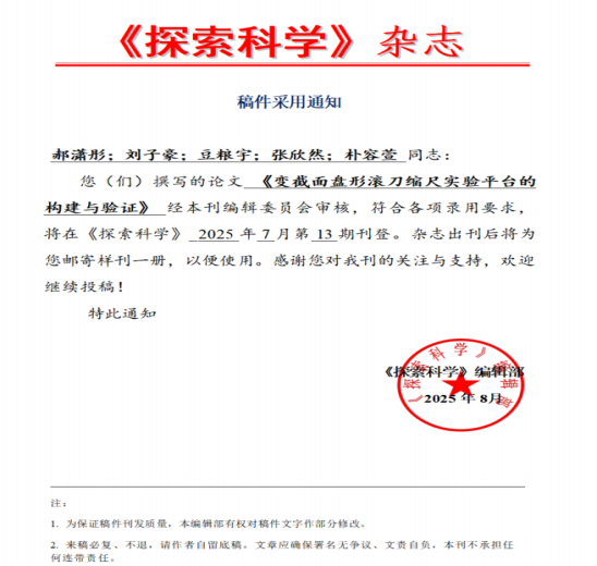 在科研探索中,郝潇彤同样硕果累累。她以第一作者身份国家级期刊上发表一篇《变截面盘形滚刀缩尺实验平台的构建与验证》论文,并参与另一篇《学生干部经历对就业影响的研究》国家期刊论文的撰写;作为核心成员,她拥有国家计算机软件著作权1项,并将理论成果转化为实际应用。此外,她积极投身科研项目,参与省级大创计划、吉林省教育厅科学研究项目及吉林省横向课题。