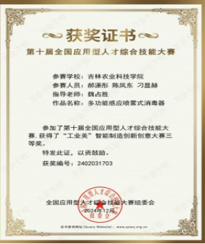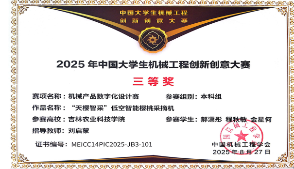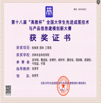 在学科竞赛领域,她一路过关斩将:第十届全国应用型人才综合技能大赛国家三等奖、第十八届“高教杯”全国大学生先进成图技术与产品信息建模创新大赛国家级三等奖、2025年中国大学生机械工程创新创意大赛机械产品数字化设计赛国家级三等奖,以及东北赛区二等奖、第十二届全国大学生机械创新设计大赛吉林赛区创意组省级一等奖,累累硕果彰显其扎实的专业功底与突出的创新能力。