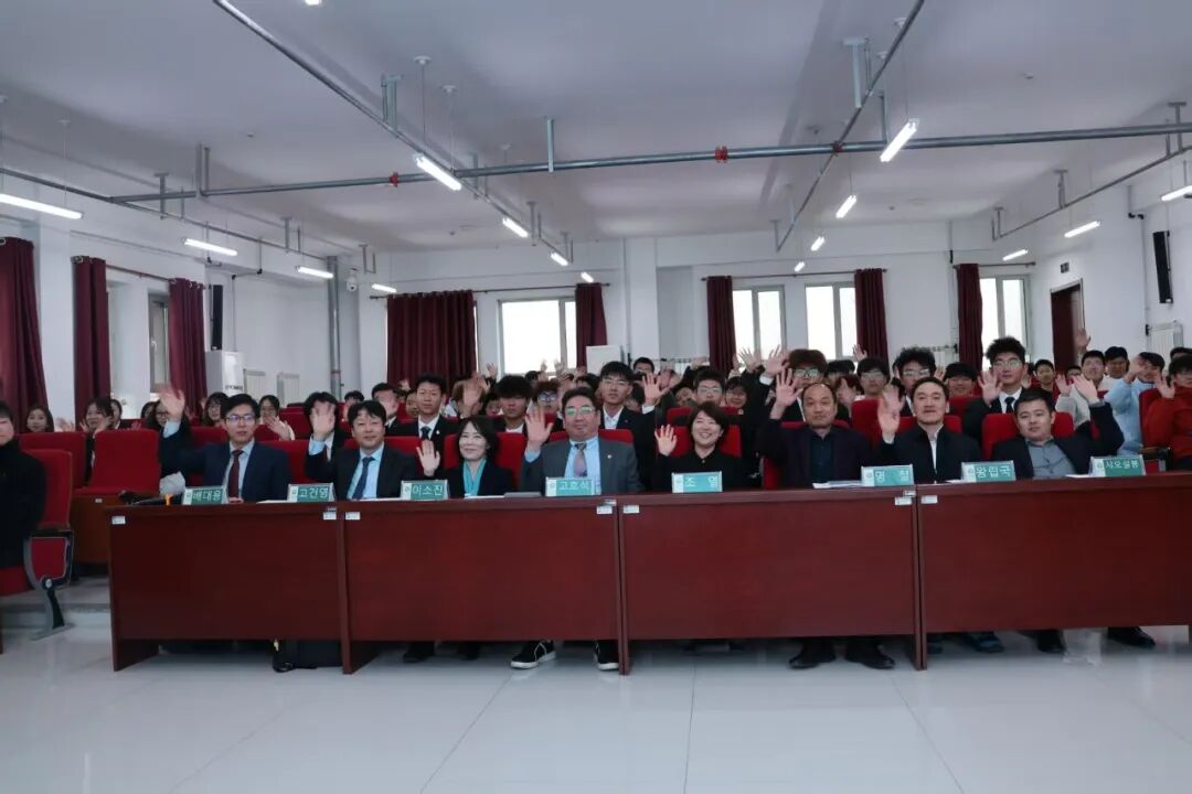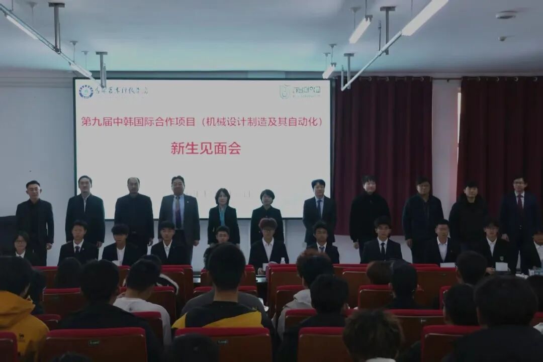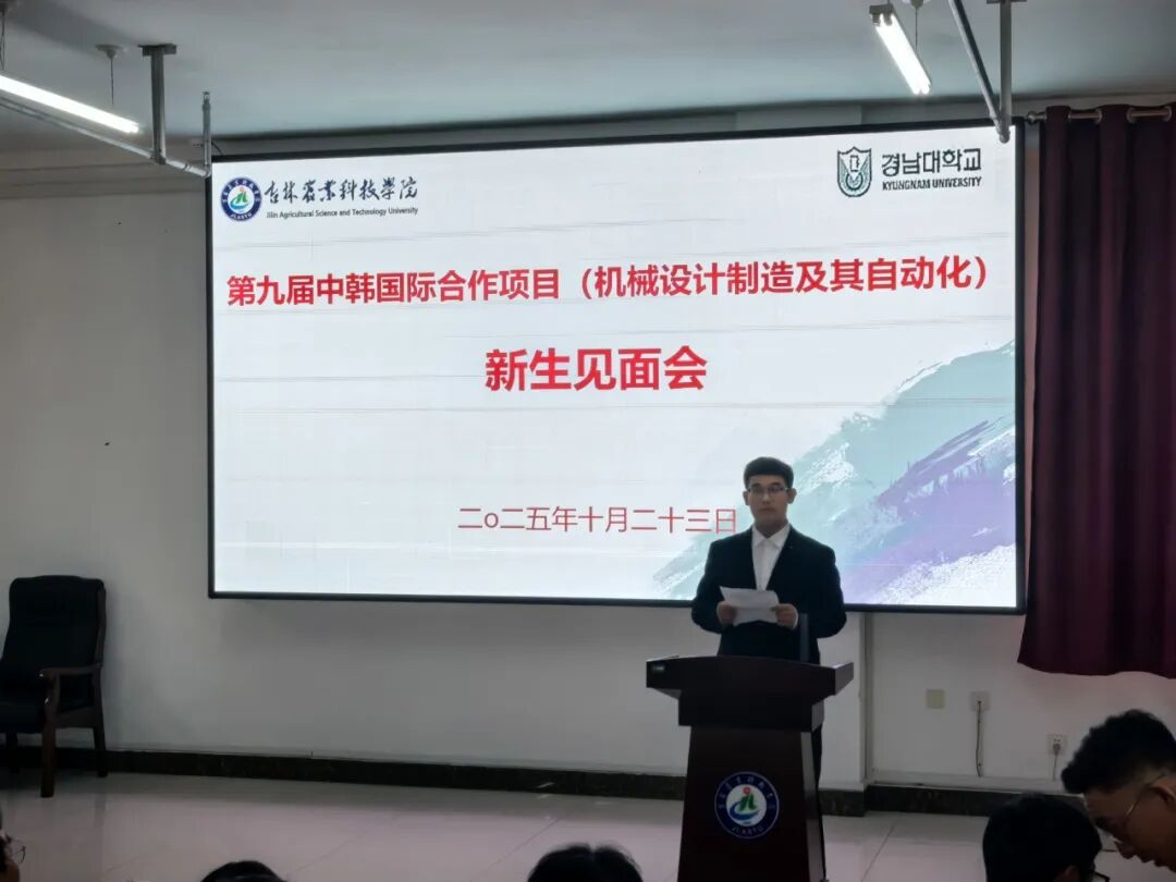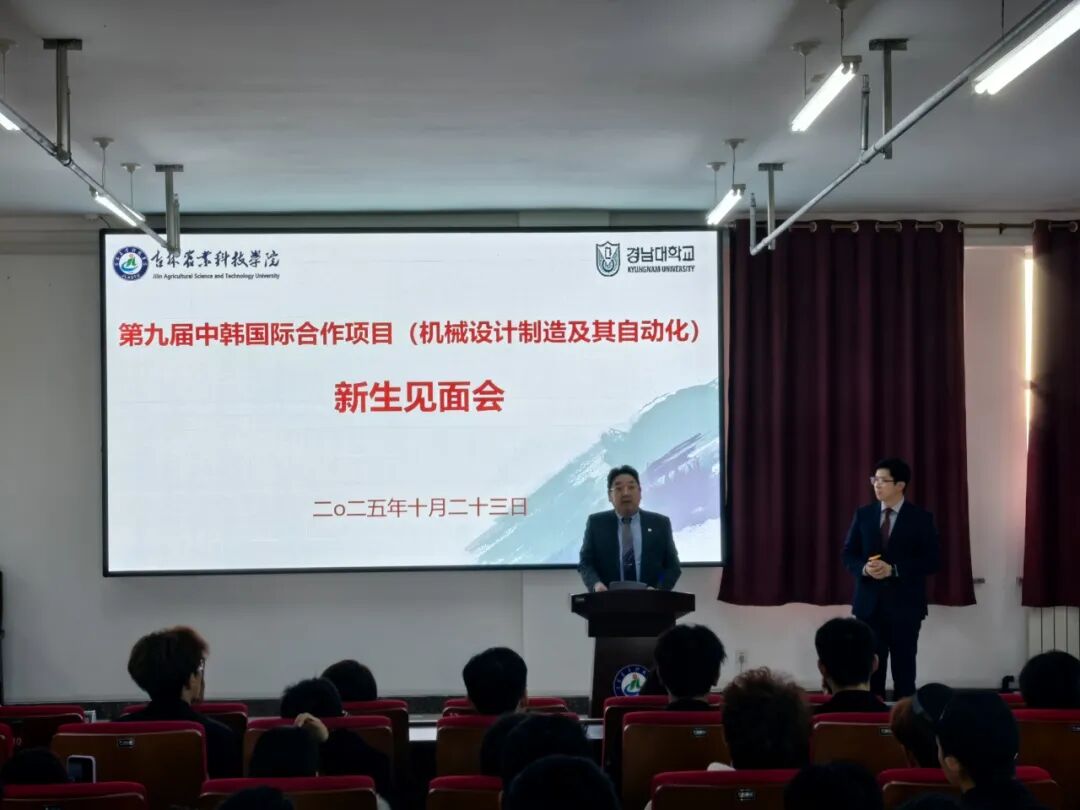 第九届中韩国际合作项目(机械设计制造及其自动化专业)新生见面会于 10 月 23 日下午 15:00 在明德楼520 第二报告厅成功举办,本次典礼由机械与土木工程学院党总支书记姚楠主持,吉林农业科技学院副校长赵悦,机械与土木工程学院院长明哲,副院长崔博,殷飞。中韩合作项目负责人魏占胜。学办主任王嗣胤,合作班辅导员祝振乙,国际合作与交流处处长王立国,国际合作与交流处副处长王钰维,国际合作与交流处项目负责人李龙飞共同出席本次会议;庆南大学副校长高湖锡,国际处处长李素真,部长高健荣,中国交流项目负责人,中韩交流合作院副院长裴大庸,机械工学部学部长陈哲圭,机械工学部教授王德炫,申正活,中国办事处代表肖峰以及翻译高君共同出席本次会议。
