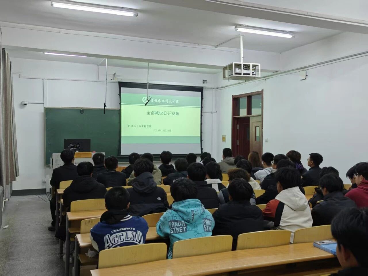 为深入贯彻落实习近平总书记关于防灾减灾救灾重要论述精神,严格执行党中央、国务院关于防灾减灾工作的决策部署,10月26日,机械与土木工程学院组织25级全体学生观看全面减灾公开课系列视频,我院学工办主任王嗣胤,副主任韩凯旭以及学工办全体教师,主席团成员参与。