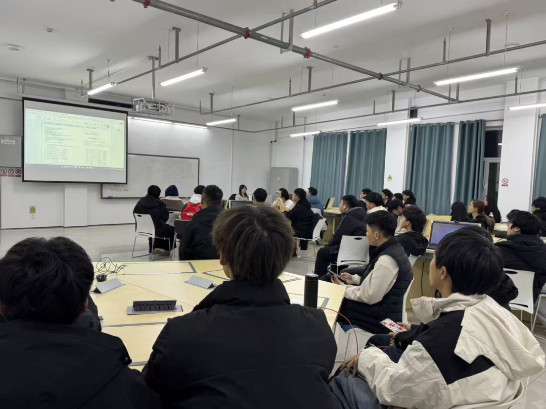 活动以沉浸式体验为核心,通过“大屏呈现+实时讲解”的直观形式,让同学们深度感受参数化设计与可视化协作的魅力。讲解过程中,于坤玉同学结合实际案例展开教学,利用BIM三维模型建立企业设计构件数据库,到将其应用于项目安全管理,再到对构件材料进行量化统计材料用量等,每一个专业知识点都紧密结合实际场景。